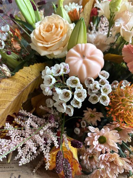 Why not add on a beautiful pumpkin spice candle from Knot & Flame to your bouquet.